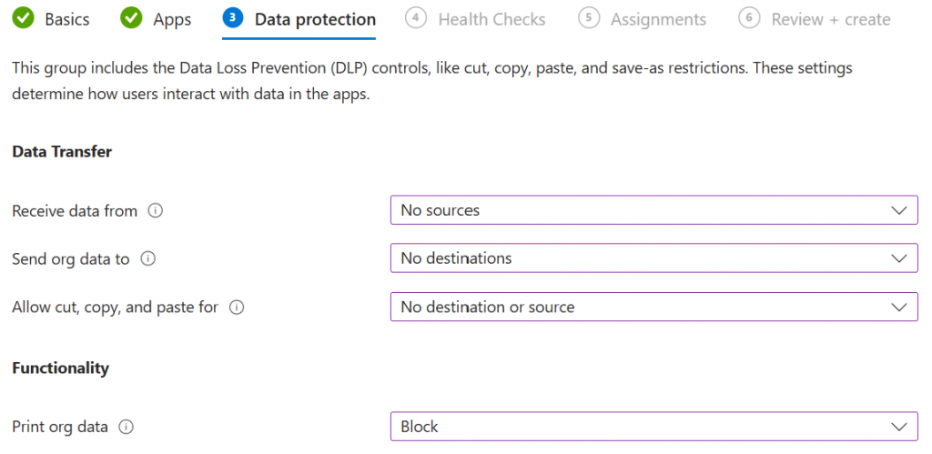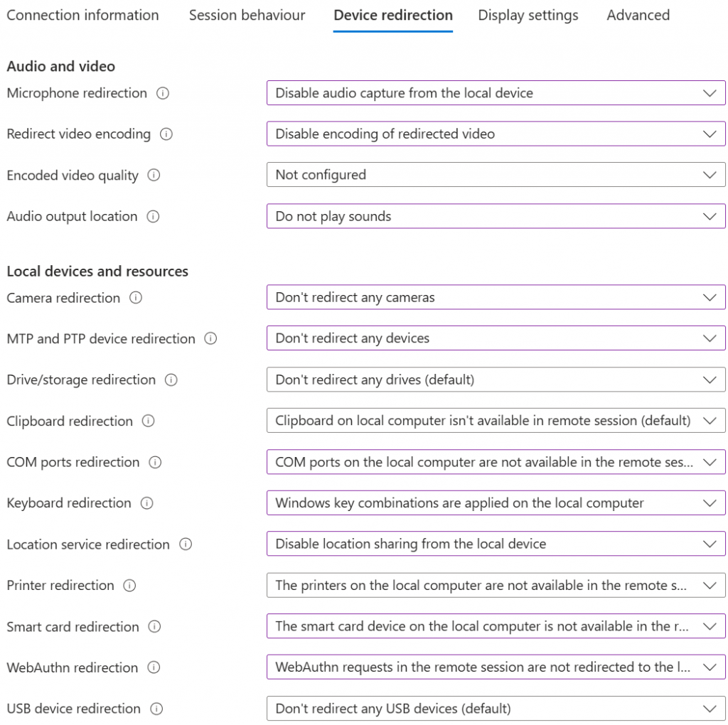 As in the App Protection policy, it is possible to control how data can me moved in and out of the session using the Device Redirection settings. This affords us greater granularity over which devices, and therefore data, can be passed between the local device and the remote session host.